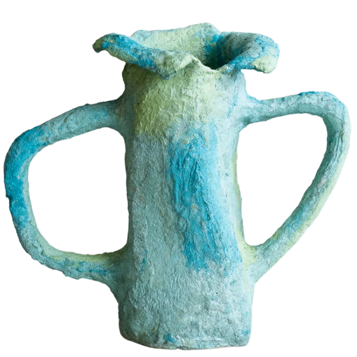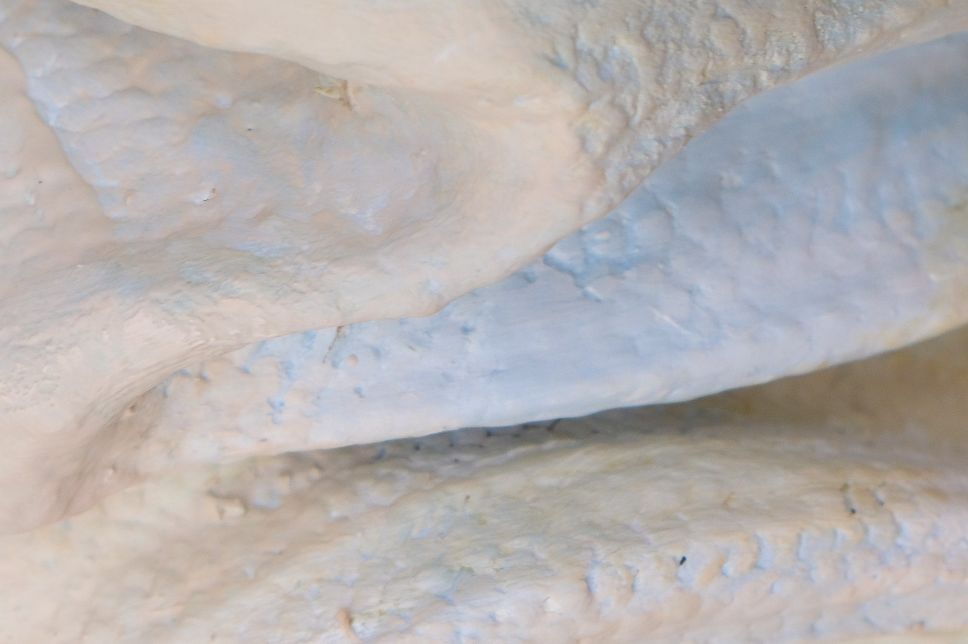 Recycled plastic residue from a second-cycle melting recycling technique, cement, calcium, sprayed polystyrene, pigment, and lacquer. The recycled material is hand-sculpted and reinforced through successive layers of applied compounds, resulting in a solidified sculpture. 2023. Private commission.